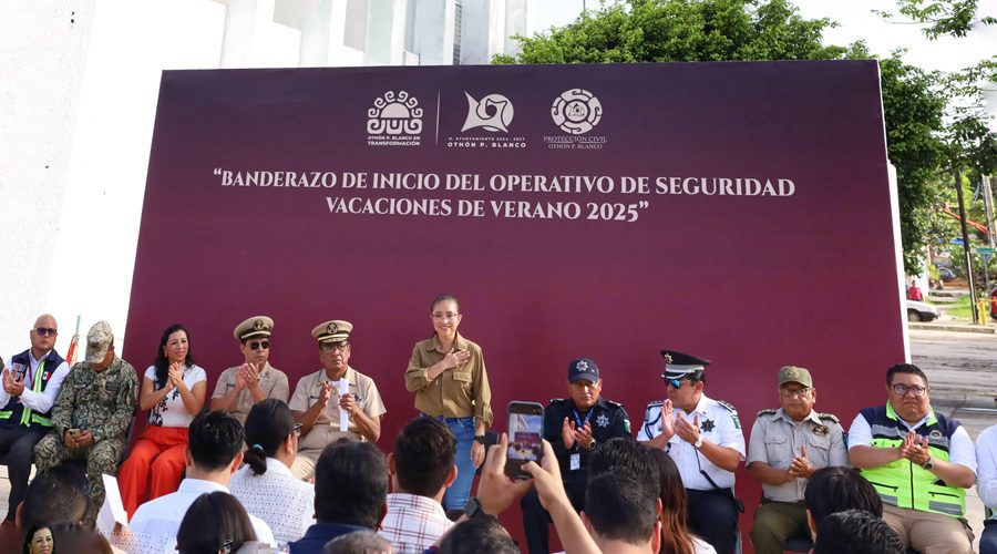 CHETUMAL, 11 de julio. Con el firme compromiso de proteger y salvaguardar la integridad física de turistas locales, nacionales, internacionales y población en general durante esta temporada vacacional, la presidenta municipal de Othón P. Blanco, Yensunni Martínez Hernández, encabezó el banderazo oficial del Operativo de Seguridad Vacaciones de Verano 2025.