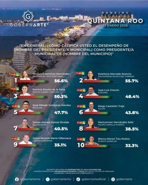 CHETUMAL, Quintana Roo, 14 de enero de 2026.- La presidenta municipal de Othón P. Blanco, Yensunni Martínez Hernández, sorprendió al iniciar este 2026 como la alcaldesa mejor evaluada de todo Quintana Roo, al encabezar la encuesta de medición de desempeño elaborada por la organización GoberArte.