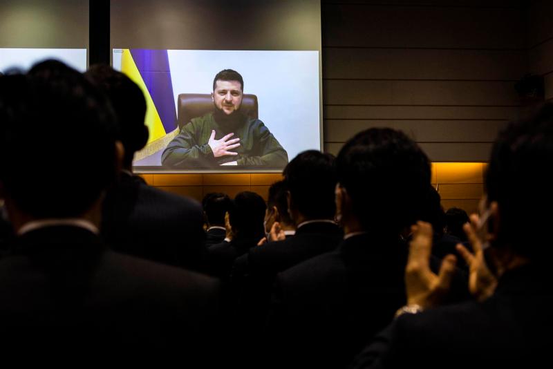 El presidente ucraniano, Volodímir Zelenski, duplicó sus esfuerzos diplomáticos en favor de la paz con sendas intervenciones telemáticas ante los parlamentos de Japón y Francia y una petición común: que se aumente la presión contra Rusia para forzarle a buscar una solución pacífica.